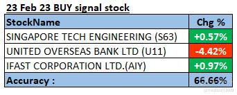 Good morning, everyone, an update on 23 Feb 23 SG Stock predicted result. The model has gotten 66.66% accuracy for getting 2 out of 3 stocks correct.