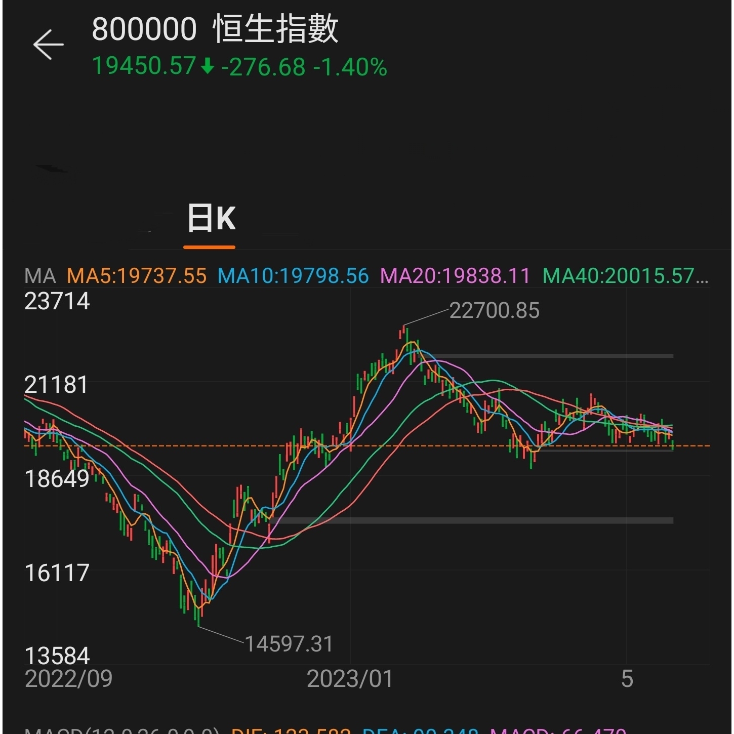 恆生指數於19535點開市,09:33分已經全日最低位19352點,其後向上反彈,高見19610點,期後再次向下回落,收報19450點。