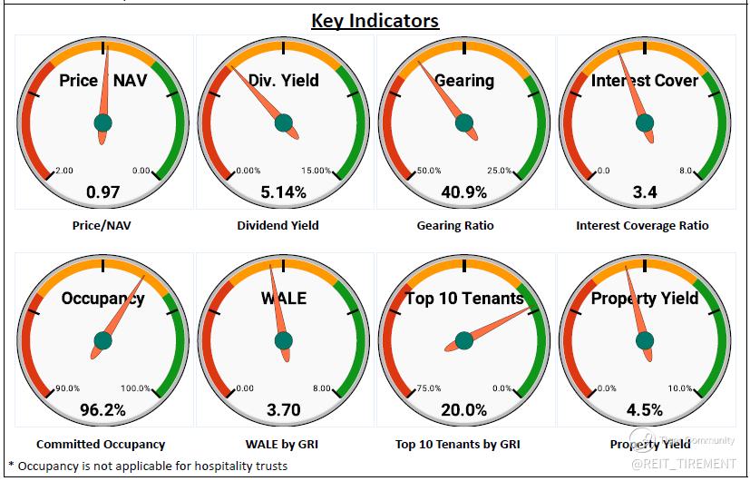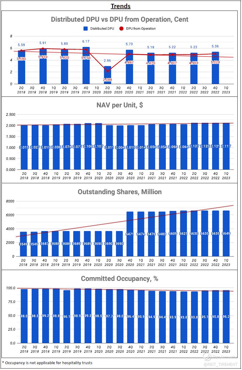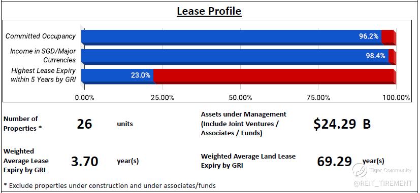 The performance has shown improvement compared to the previous quarter and the occupancy rate has steadily increased from its low point of 93.6% in 1Q 2022 to its current level of 96.2%. In terms of debt, only 4% needs refinancing this year, with the fixed rate being around the median level for SREITs. However, for the lease at Gallileo, Commerzbank A.G. has given notice to end the lease in January 2024. The manager expected the building to be non-income generating for at least 18 months, and Commerzbank A.G. is 1 of the top 10 tenants, contributing 1.8% of gross rent.