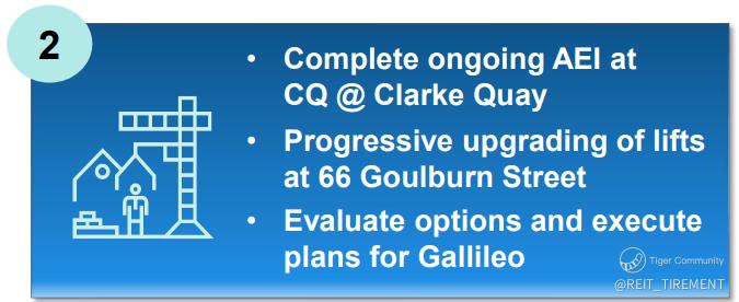 AEI for CQ @ Clarke Quay is completed and life upgrading for 66 Goulburn Street is progressively carried out.