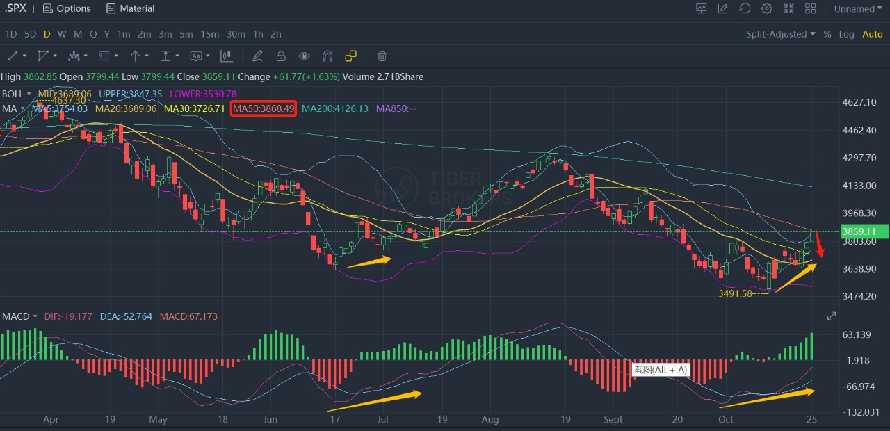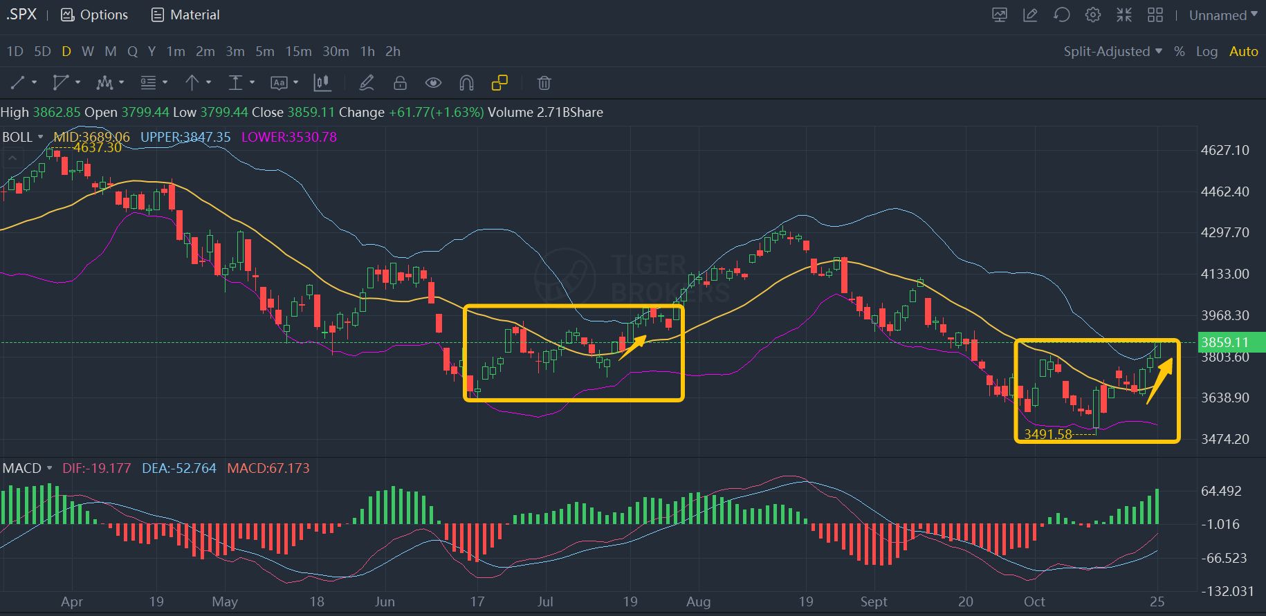 In addition, from the charts of Bollinger Bands: $S&P 500(.SPX)$ successfully stood on the middle Bollinger line on last Friday, which is the first time since July to break through and stand firm, so the medium-term upward trend still depends on the support of Bollinger middle rail.