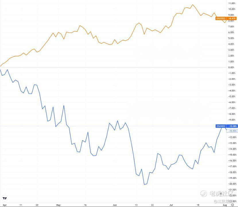 Figure 1: Since July, US stocks have rallied; the U.S. dollar index has retraced.(orange: dollar index; blue: SPX futures)