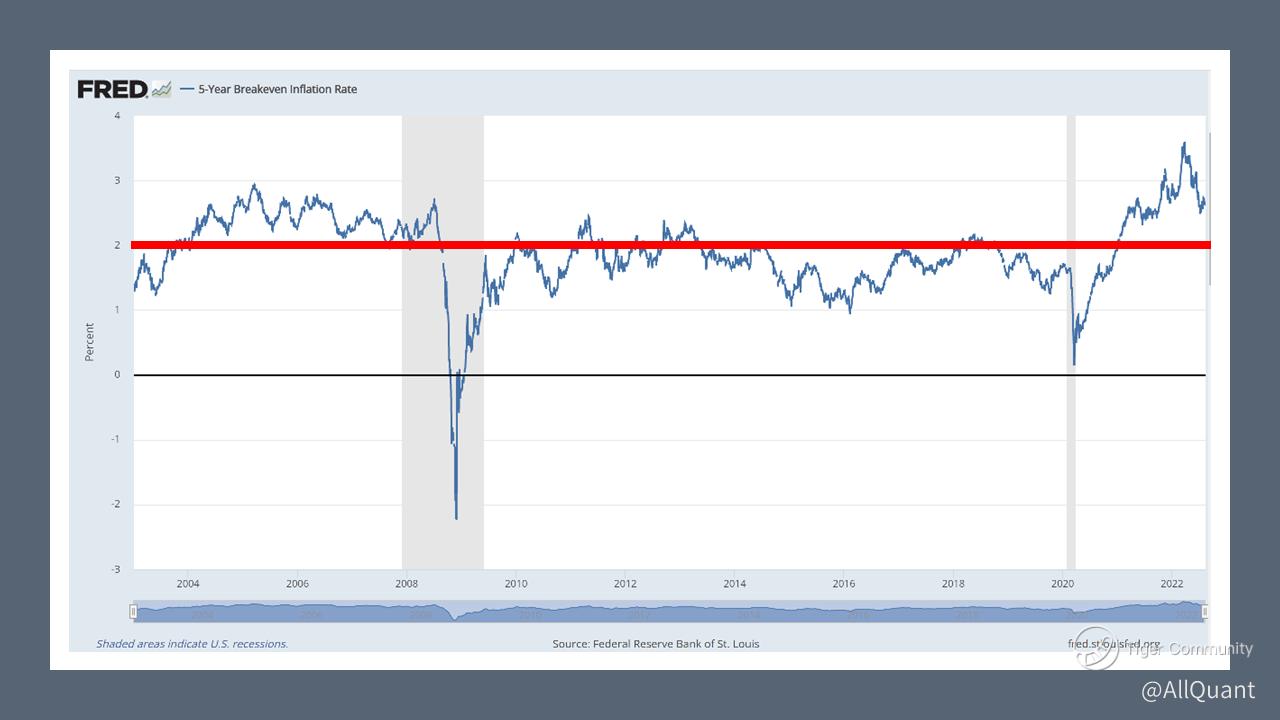 Historically, the 5-year breakeven rate tends to hover around 2% during normal times. 2% is also the so-called neutral rate according to the Fed. The current 5-year breakeven rate is above this neutral rate. It remains to be seen whether it can come back down to 2%. It can remain above 2% for a protracted period just like what happened before the Great Financial Crisis in 2008.