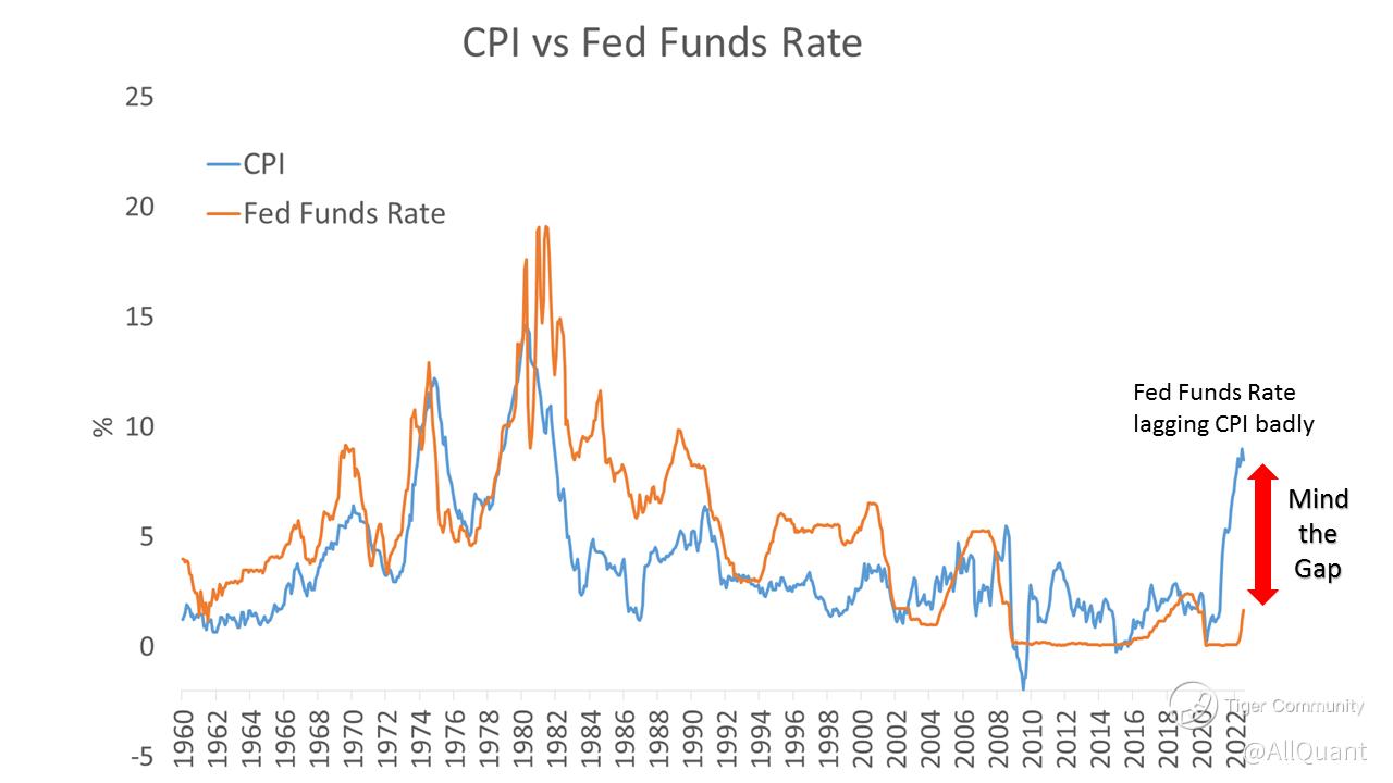 There is no doubt that the single most important driver for global markets this year is inflation. Every single economic release that gives any clue as to whether inflation is coming under control is keenly watched. Any under or over-estimation by market participants leads to an immediate market reaction. My thesis is that inflation can only come under control if the current Fed Funds rate is commensurate with the current year-on-year inflation as measured by Consumer Price Index (CPI YoY). This is backed up by the historical relationship between CPI and the Fed Funds rate.