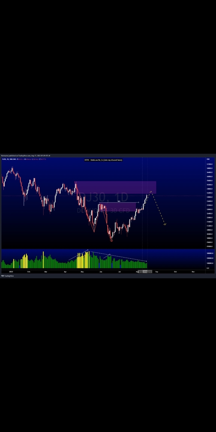 Price is currently playing out as analyzed last week. Currently price is on an uptrend and has broken structure to the upside. However, this break of structure to the upside is not accompanied by high volume. We can see volume increasing on all the down moves. We are reaching the bearish POI at 34343.2 and expect price to retrace to the downside from there.